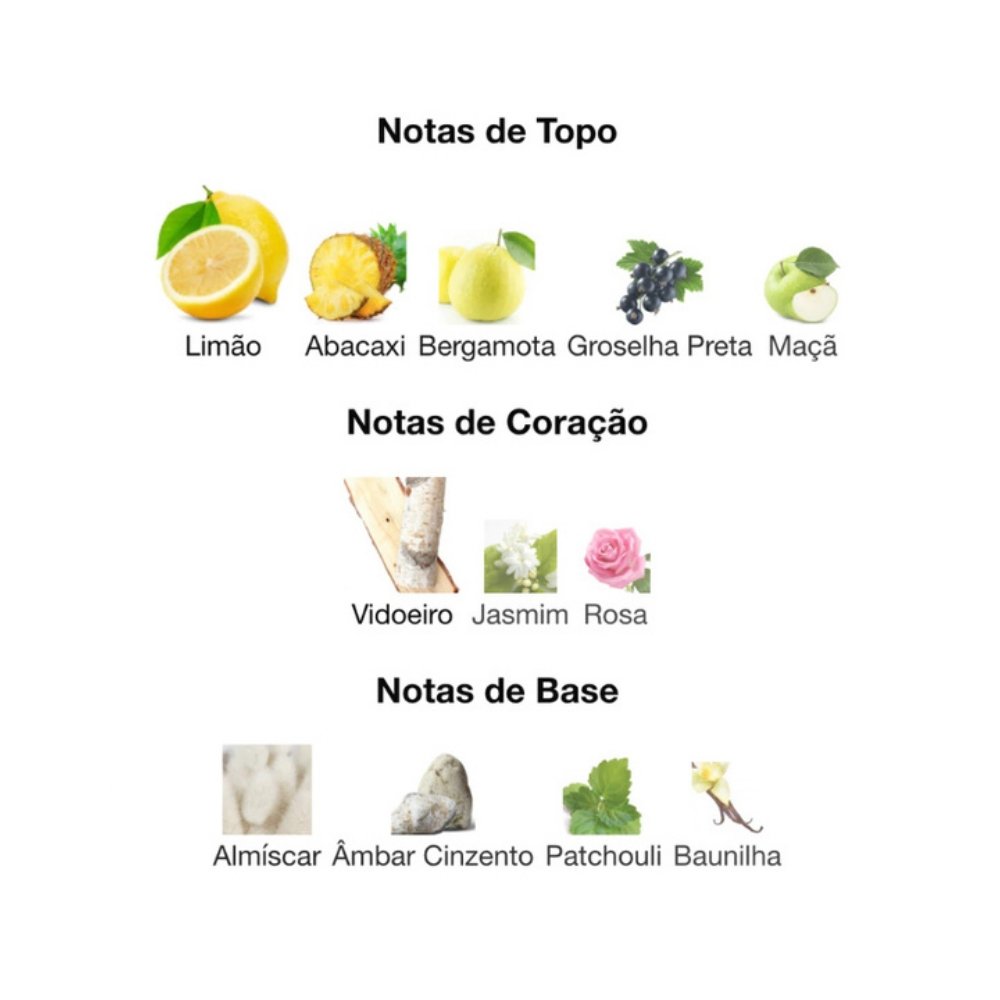 A abertura cítrica de limão, abacaxi e bergamota evolui para um coração amadeirado e defumado, finalizando com âmbar, almíscar e baunilha.